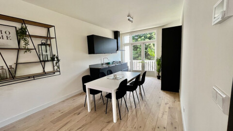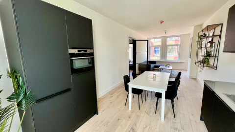 High-end renovated apartment with modern and luxurious amenities and a terrace. This bright apartment features beautiful wooden flooring, floor heating, an open black design kitchen, two bedrooms, a luxurious bathroom, brand new furnishing and nice balcony! Ideally located within walking distance of the shopping street Theresiastraat and the Haagse Bos (forest of The Hague).