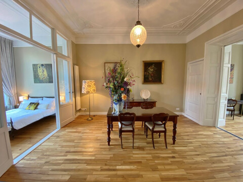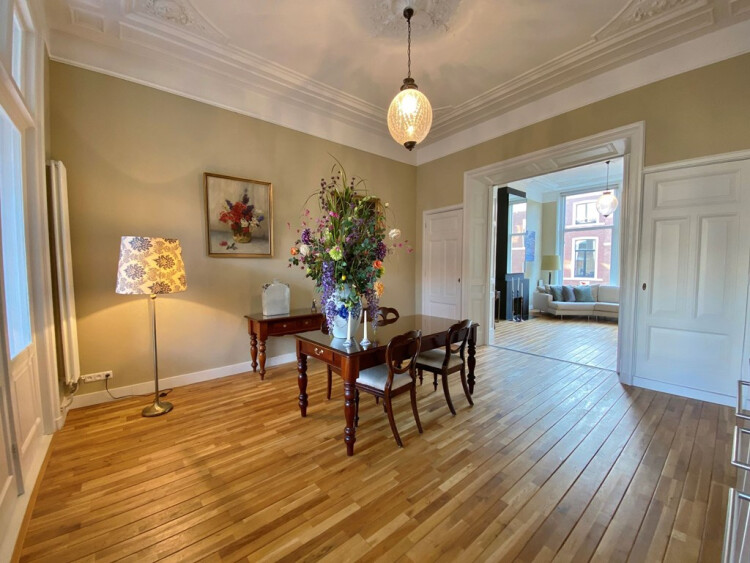 Stately and magnificent 2 bedroom apartment in the green and popular Archipelbuurt, featuring a splendid combination of modern luxury and charming original details. This apartment has been renovated with all comforts: open kitchen with island, spacious and bright living room with separate dining room, a bath and shower in a relaxing bathroom, original ornamental ceilings, a fire place, heating covers, wooden flooring, high ceilings - everything has been thought of to fit this living experience to your needs & wishes.