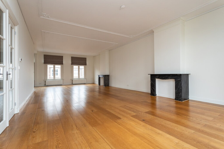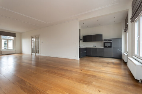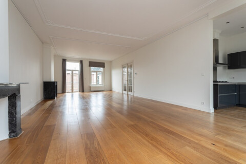 Entree appartement, trap naar de woonverdieping, gang, openslaande deuren die toegang geven tot de woonkamer. Zeer ruime doorzonwoonkamer met klassieke ornamenten op het plafond en sierlijke schouwen. Vanuit de woonkamer is er toegang tot het balkon, gelegen op het noordwesten, perfect voor middag- en avondzon. De open keuken is uitgerust met diverse inbouwapparatuur, waaronder een vaatwasser, gasfornuis, oven en koelkast. Op deze verdieping bevindt zich tevens een modern, separaat toilet met fonteintje.