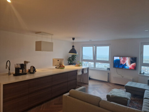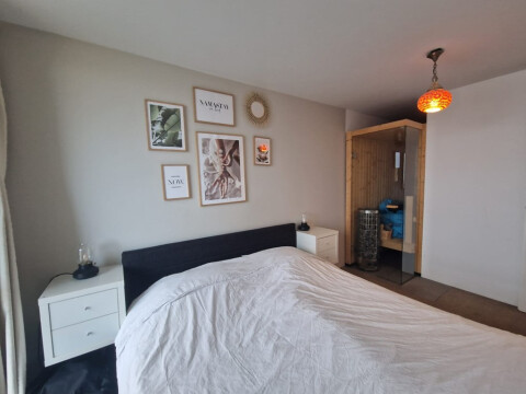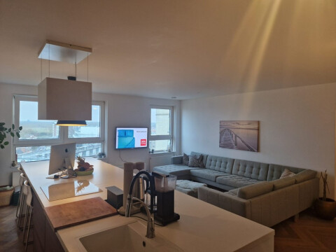 This lovely apartment is available immediately and has 2 bedrooms, a spacious bathroom with a bath. The modern kitchen has a cooking island that is fully equipped.The master bedroom also has a built-in sauna. The apartment has a very spacious living room with lots of light and a beautiful view of the sea and Scheveningen. You can also enjoy a balcony with a beautiful view of Scheveningen after a long day.