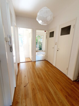 Parterre woning met toegang via centraal trappenhuis. Eigen entree met ruime overloop, riante woon/eetkamer en-suite, 1 slaapkamer aan de voorzijde, 1 slaapkamer aan de achterzijde, separate keuken met divers inbouwapparatuur, badkamer met douche. Riante zonnige achtertuin. In de kelder van het complex bevindt zich nog de privé berging.