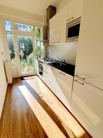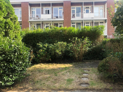 Parterre woning met toegang via centraal trappenhuis. Eigen entree met ruime overloop, riante woon/eetkamer en-suite, 1 slaapkamer aan de voorzijde, 1 slaapkamer aan de achterzijde, separate keuken met divers inbouwapparatuur, badkamer met douche. Riante zonnige achtertuin. In de kelder van het complex bevindt zich nog de privé berging.
