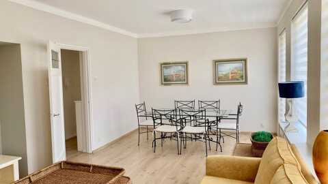 Shared entrance from the street with stairs to the 2nd floor. Entrance door to the apartment. Hallway with doors to all spaces. Sunny living room with French balcony. Master bedroom with doors to the backside balcony and doors to the bathroom with bath, shower, sink and towel radiator. 2nd bedroom with ample built-in wardrobe space and doors to the balcony as well. Kitchen with dishwasher, 4-pit gas stove, fridge / freezer, built-in oven and ample storage space. Washing machine and dryer available as well. Separate toilet. Laminate flooring and double glazed. Centrally heated.