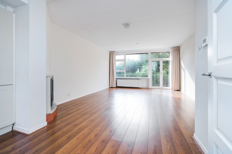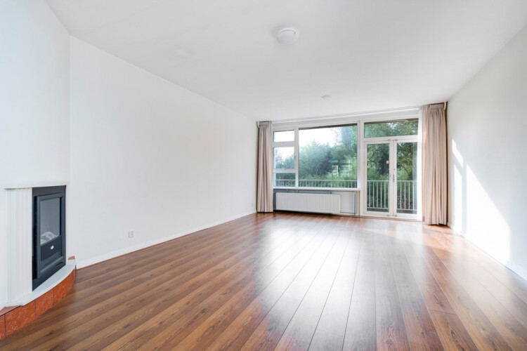 De ruime en lichte woonkamer heeft openslaande deuren naar het zonnige balkon over de volle breedte met fantastisch vrij uitzicht over de gemeenschappelijke tuin en het groen.