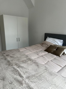 Stairs or elevator to the first floor. Entrance to the apartment. Hallway with access to the bedroom, two bathrooms, kitchen and living room. Spacious and bright living room. Two spacious and bright bedrooms with double beds, wardrobes and large windows. Bathroom I with toilet, bidet, sink and bath. Bathroom II with toilet, sink and shower. Private storage room in the basement. Kitchen fitted with fridge, oven, gas stove, dishwasher and washing machine. Two balconies, the small balcony is connected to the kitchen, the other balcony is connected to the living room. Parking on private parking space.