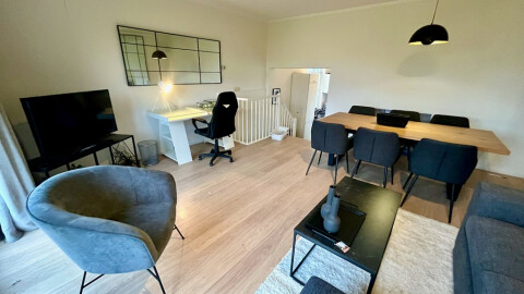 Entrance from the street to shared hallway. Doors to the apartment. Spacious living room with doors to the sunny garden. Kitchen with appliances such as a dishwasher, freezer / fridge and oven / microwave.