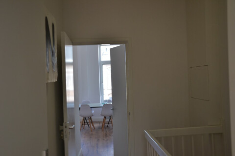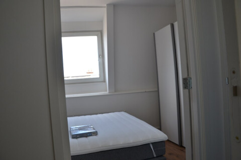 Entrance from street. Stairs to 2nd floor. Doors to the apartment. Living room with open kitchen with dish washer, freezer / fridge, oven, gas stove. Doors to small balcony. Toilet in the hallway. From the living room there are stairs to the 3rd floor with the bathroom with walk-in shower, sink, towel radiator and the bedroom. The bedroom has access to another balcony. Washing machine available. Wooden laminate floors, double glazed and centrally heated.