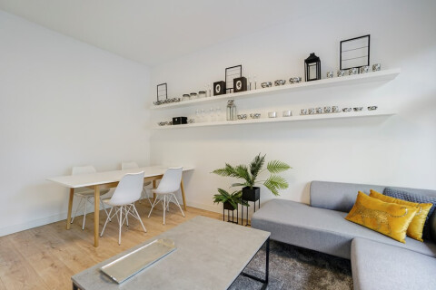 Open porch to 1st floor. Entrance into the corridor with bedroom 1 directly on the right side, located at the front of the building with large tilt-turn window. The corridor gives access to the rest of the apartment, to the right a spacious living room with large windows on the street side. The living room is very bright and gives a nice and welcoming impression, fitted with comfortable L-couch, dining table & dining chairs and 50 inch smart TV. Bedroom 2 is located at the rear of the building. On the left side is the bathroom with walk-in shower, toilet, washing machine & dryer combination, and marble look tiling with chrome and white finishes.