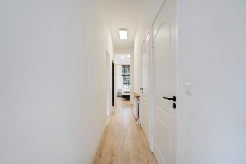 Right ahead of the hallway is the separate kitchen. This is equipped with brand new appliances, dishwasher, oven, electric stove and fan, and gives access to the balcony which is located at the rear. Bedroom 3 is on the right rear side of the building with access from the hallway and access to the balcony. The spacious master bedroom with direct balcony access is a true oasis. Separate enclosed storage room. Functional 4-room apartment with user-friendly layout and high ceilings of approx. 3m.