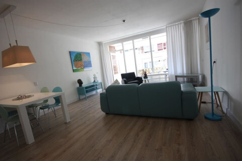 Entrance and hallway of the building, elevator to the second floor. Entrance ; spacious living room with elegant new furniture and an open kitchen with all new equipment. Acces to the spacious balcony (approx. 12m²). New bathroom with toilet, shower, wash stand and a washing machine.