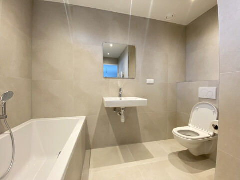 Ruime en lichte woonkamer met een mooie open keuken met inbouwapparatuur (vaatwasser, koelkast, vriezer, combi oven-magnetron). De woonkamer biedt toegang tot het zonnige balkon. Aan de achterzijde van de woning zijn de 3 slaapkamers gelegen. De masterbedroom geeft toegang tot het balkon aan de achterzijde en de badkamer ensuite. Deze badkamer is voorzien van ligbad, inloopdouche, wastafel en de tweede toilet. De 2e badkamer die te bereiken is vanuit de overloop is voorzien van inloopdouche en wastafelmeubel. Vanuit de overloop tevens toegang tot de separaat toilet, inbouwkast met wasmachine en droger aansluiting.