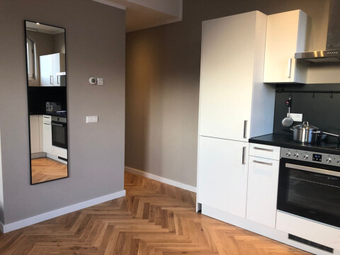 Entrance from the street. Stairs to the first floor with long hallway. Doors to all the apartments. Entrance to the apartment to small hall which is attached to the living area with modern open designer kitchen. Kitchen with appliances such as dishwasher, stove, oven / microwave, ample storage space and fridge / freezer. Bedroom with comfortable boxspring bed and wardrobe space. Bathroom with walk-in shower, sink, towel radiator and toilet. Wooden parquet flooring, centrally heated.