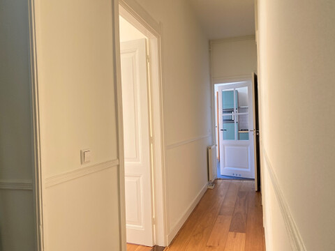 Entree via afgesloten portiek, trap naar de eerste verdieping. Overloop met toilet en ruime vaste voorraadkast. Voorzijkamer, ruime en lichte woonkamer en-suite met schuifseparatie naar de eerste slaapkamer. Moderne gesloten keuken, voorzien luxe inbouw apparatuur en toegang tot het ruime balkon op het Zuidwesten. Een tweede ruime slaapkamer aan de achterzijde. De woning is volledig voorzien van dubbel glas, deels gestoffeerd en o.a. voorzien van parket vloeren.