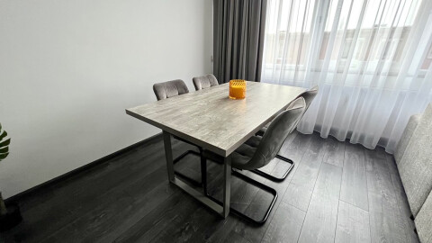 Entrance to hallway. Around the corner you reach the modern, spacious living room. In the corner of the living room you will find a lovely, open kitchen with built-in fridge/freezer, gas stove with oven, and a kitchen island with bar - perfect for eating breakfast, dinners, or a drink with friends. Dining/living area fitted with a dining table, chairs, comfortable couch and coffee table. Large windows for a light, open view. Bathroom featuring a walk-in shower, sink and washing machine. Seperate toilet.