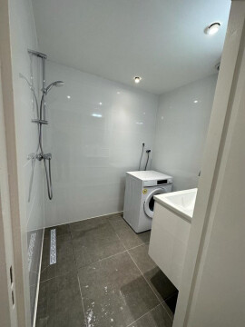 Entrance to hallway. Around the corner you reach the modern, spacious living room. In the corner of the living room you will find a lovely, open kitchen with built-in fridge/freezer, gas stove with oven, and a kitchen island with bar - perfect for eating breakfast, dinners, or a drink with friends. Dining/living area fitted with a dining table, chairs, comfortable couch and coffee table. Large windows for a light, open view. Bathroom featuring a walk-in shower, sink and washing machine. Seperate toilet.