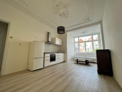 Indeling: gezamenlijke entree op de begane grond, trap naar de 1e etage. Entree appartement met toegang tot lange hal. Woonkamer van ca.: 30 m2 aan de achterzijde met open keuken voorzien van luxe keukenapparatuur zoals een inductiekookplaat, afzuigkap en koel/vriescombinatie. Vanuit de woonkamer toegang tot de zeer ruime slaapkamer van ca.: 23 m2 aan de voorzijde. Badkamer en apart toilet bereikbaar vanuit de hal. Badkamer van ca.: 8 m2 voorzien van een inloopdouche met wastafel en wastafelmeubel. Zowel de woonkamer als de slaapkamer hebben een prachtig ornamenten plafond.