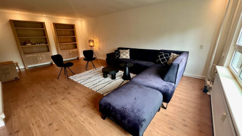 Spacious living room with large sofa and big windows. A dining table will be placed here as well (not in photos). Semi-open living kitchen with table and kitchen island. Appliances such as oven, microwave, fridge/freezer, dishwasher etc. available. Ample storage space.