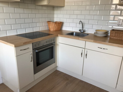 Elevator access to the second floor. Hallway leading to the apartment door. The door opens up into a semi open hall, that gives acces to the living room with large windows in the front. L-shaped kitchen with induction stove. The balcony can be accessed from the kitchen. Separate bedroom. Bathroom with shower, toilet, and sink.