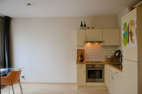 Elevator access to the second floor. Hallway leading to the apartment door. The door opens up into a semi open hall, that gives acces to the living room with large windows in the front. L-shaped kitchen with induction stove. The balcony can be accessed from the kitchen. Separate bedroom. Bathroom with shower, toilet, and sink.