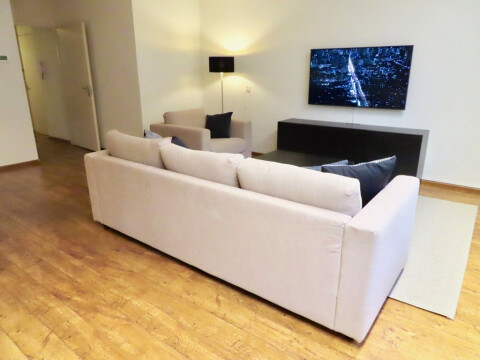 Entrance from the street. Elevator to the 2nd floor. Entrance to the apartment with small hallway. Spacious living room with luminous windows. Open kitchen with dish washer, stove, oven, microwave and freezer / fridge. Storage room with washing machine and shelves.