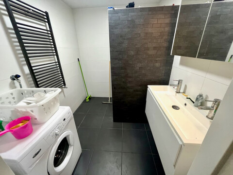 Bathroom with walk-in shower, sink, towel radiator and washing machine Separate toilet.
