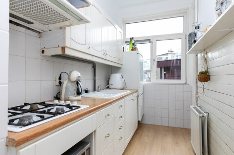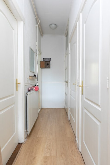 Entree via portiek-trap op de eerste verdieping, functionele gang met apart toilet, berging voor wasmachine, slaapkamer met toegang naar de badkamer, keuken met veel daglicht en de andere slaapkamer. De ruime woonkamer ensuite met inbouwkasten geeft veel mogelijkheden voor eventuele aparte eetkamer, tevens heeft deze aan de achterzijde openslaande deuren.