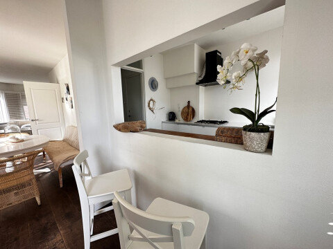 EERSTE WOONLAAG: Entree appartement, hal met toegang naar de woonkamer en de half open keuken. In de hal bevindt zich tevens de trap naar de 2e woonlaag en een separaat toilet. Ruime woonkamer met uitzicht op de zee en toegang tot het balkon. Mooie, half open keuken met ook toegang tot het balkon en (inbouw)apparatuur zoals vaatwasser en combi-oven.
