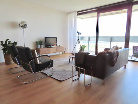 Lift naar 40e verdieping. Hal en entree naar het appartement. Ruime hal met toilet en ruime berging met oa ruimte voor wasmachine en droger. Dit appartement heeft een ruime en lichte woonkamer met open keuken en geheel overdekt door ramen & schuifpui naar het balkon. De moderne design keuken is voorzien van alle benodigde inbouwapparatuur: een koelkast met vriezer, vaatwasser, inductie kookplaat en oven. De woning beschikt over 3 slaapkamers en een luxe badkamer met ligbad, wastafel en douchecabine. Het toilet bevindt zich apart in de gang.