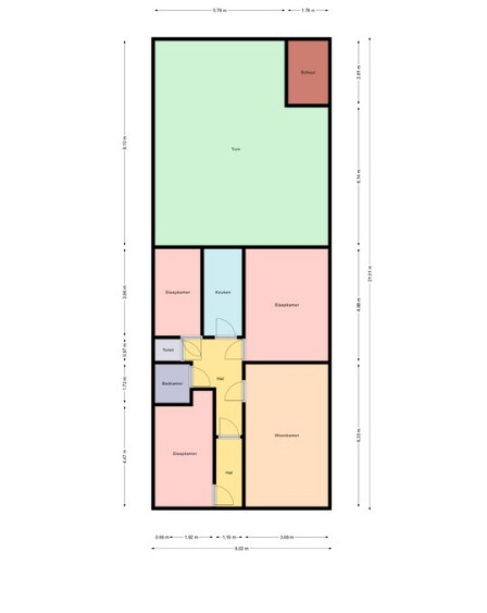 Open portiek, entree appartement, gang met woonkamer van ca. 23 m2, eerste slaapkamer aan de voorzijde van ca. 12 m2. Badkamer met regendouche en wastafel van ca. 3 m2. Apart toilet van ca. 1 m2. Tweede slaapkamer gelegen aan de achterzijde van ca. 18 m2 en derde slaapkamer van ca. 8 m2. Keuken van ca. 7 m2 voorzien van combi oven, kookplaat en afzuigkap. Vanuit de keuken toegang tot ruime tuin van ca. 65 m2 met serre en tuinhuis.