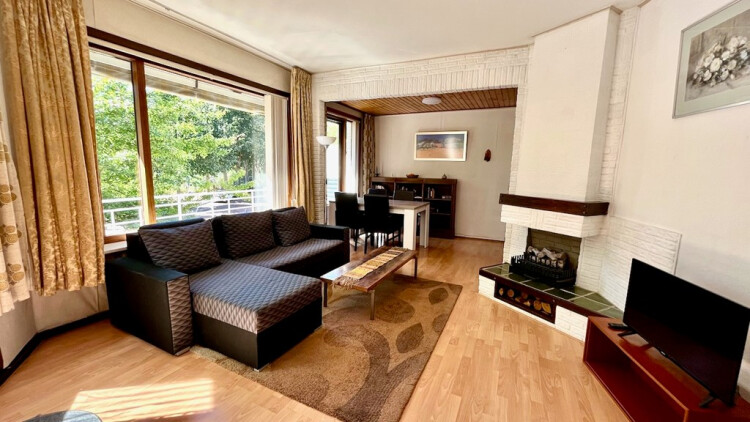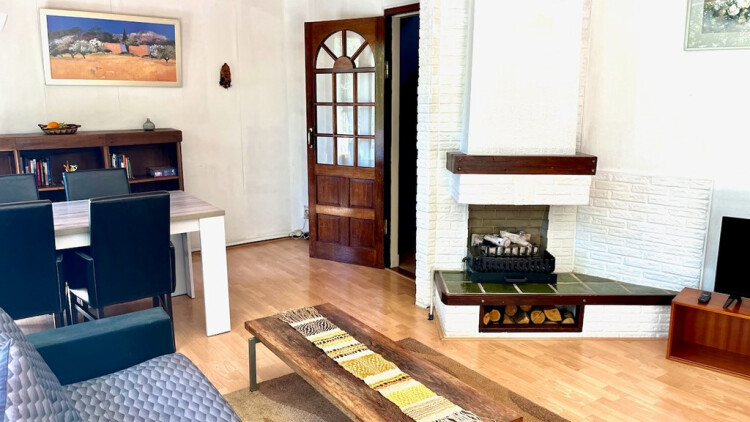 Stairs to first floor. Large and bright living room with decorative fire place and a spacious and sunny balcony. Separate kitchen with fridge/freezer, gas stove, electric oven, dishwasher and cupboard space. Toilet. Pantry/Storage room.