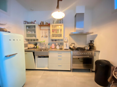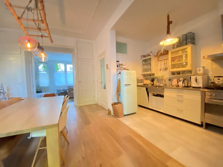 Entree op straat niveau, hal met toilet en bergruimte. Woonkamer ensuite met openslaande deuren naar de achtertuin met ligging op het noorden. Open keuken voorzien van diverse inbouw apparatuur en SMEG koel/vries combinatie, vaatwasser, oven en 6-pits gasfornuis.