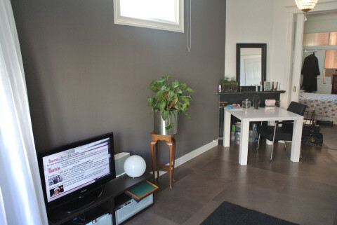 Indeling: gezamenlijk entree op begane grond, entree appartement, ruime gang met toegang tot de douche / toilet combinatie en de kelderruimte van ca.: 2 x 3, ruime woonkamer ensuite met schuifdeuren van ca.: 4 x 6 en 4.5 x 4 en inbouwkasten, aparte serre / slaapkamer van ca.: 3 x 2.5. Nieuwe keuken met diverse inbouwapparatuur (kookplaat, afzuigkap en oven) en toegang tot de achtertuin.