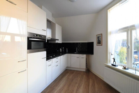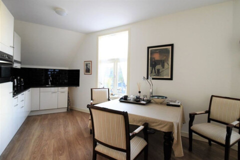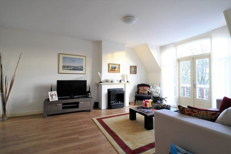 Gemeenschappelijk entree op de begane grond, entree appartement op de 1e etage, interne trap naar 2e etage waar het woongedeelte zich bevindt. Mooi ontvangst in de ruime overloop met authentieke details, zoals glas in lood ramen. De lichte woonkamer heeft een laminaatvloer, lichte gordijnen, een elektrische kachel, openslaande deuren geven toegang tot een groot terras. Er is een semi open keuken met ruimte voor een eettafel. De keuken is voorzien van