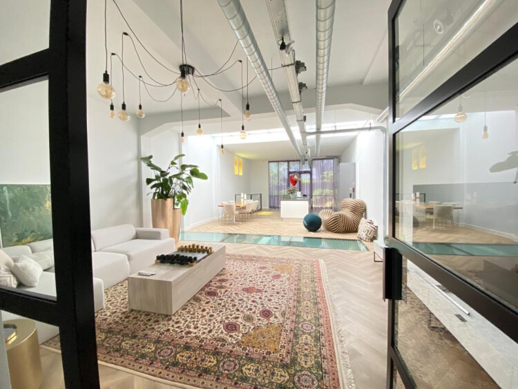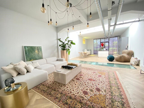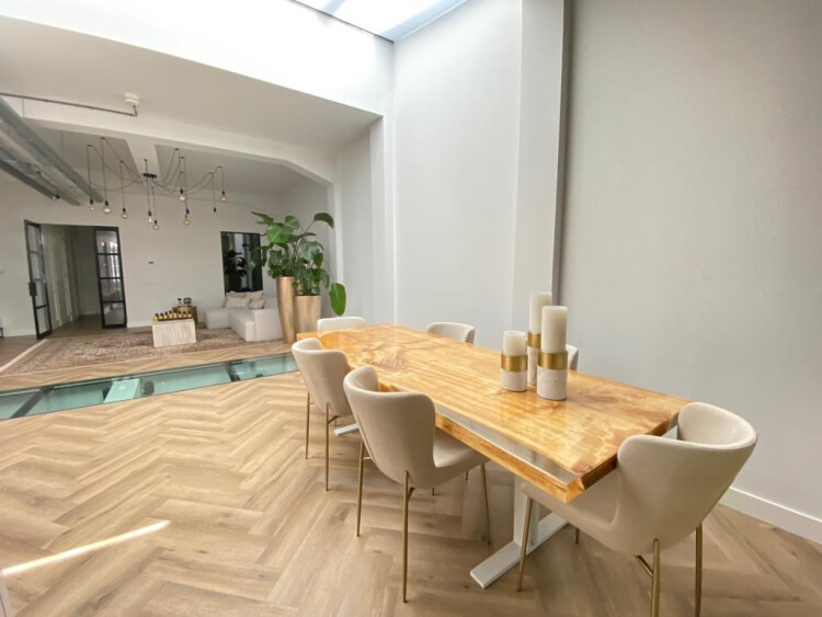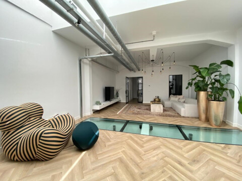 De royale woonkamer heeft elementen die ruimte een unieke ambience geven, waaronder het hoge plafond met groot dakraam (welke is voorzien met raambekleding werkend via een afstandsbediening) en industriële details. De vloer (voorzien van PVC vloerbedekking) heeft halverwege een groot doorkijkvlak van glas naar het souterrain waar zich de hoofd slaapkamer bevindt.