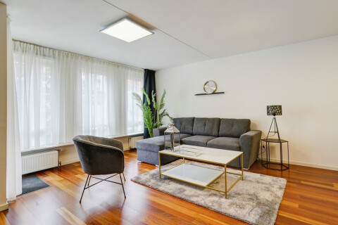 Shared closed entrance from the street. Stairs or elevator to the first floor. Entrance to the apartment's hallway with doors to all rooms. Spacious and bright living room with semi-open kitchen. Kitchen with appliances such as a dishwasher, stove, freezer / fridge, ample storage space, built-in oven / microwave. 2 spacious bedrooms with double beds and wardrobes. Bathroom with walk-in shower, bathtub, sink and towel radiator. Washing room with shelves, washing machine and dryer. Separate toilet. Private storage room in the basement for bikes. Laminate flooring and double glazed. Centrally heated.