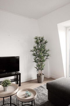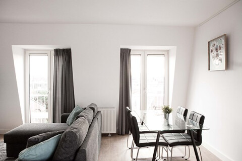 Via de hal komt u het appartement binnen via de overloop naar de open woonkamer met open lichte keuken en twee slaapkamers. De keuken is voorzien van alle gemakken en met inbouwapparatuur.