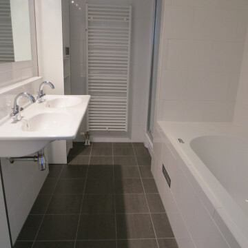 De badkamer ligt aan de hal, is voorzien van dubbele wastafel, ligbad en douche.