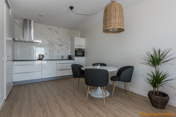 Very bright living with entrance to the sunny balcony. The kitchen is equipped with a.o electric cooking, hood extractor, dishwasher, fridge, combi oven/microwave.