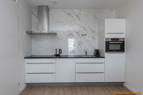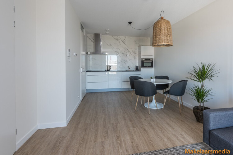 Zeer lichte woonkamer met toegang tot het zonnige balkon. De keuken is voorzien van o.a. elektrisch koken, afzuigkap, vaatwasser, koelkast, combi oven/magnetron.