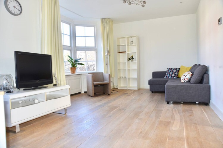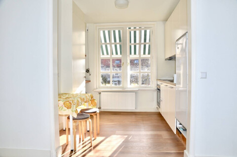 Located in a beautiful and characteristic villa. Shared entrance with stairs to the first floor. Entrance to apartment gives direct access to the bright living room, modern kitchen, master bedroom, 2nd bedroom, bathroom with toilet and washer and dryer. Spacious living room with large windows and excellent quality furniture. The brand new bathroom is fitted with a luxurious walk-in shower, sink and closet space. The semi open designer kitchen with built-in appliances such as a dishwasher, fridge/freezer combination, oven, microwave and 4 induction plates has a small dining table to enjoy breakfast as well. In the master bedroom is a comfortable box spring double bed and large wardrobe. Brand new wooden flooring throughout the apartment. There is a basement storage space, which would be perfect as a wine cellar.