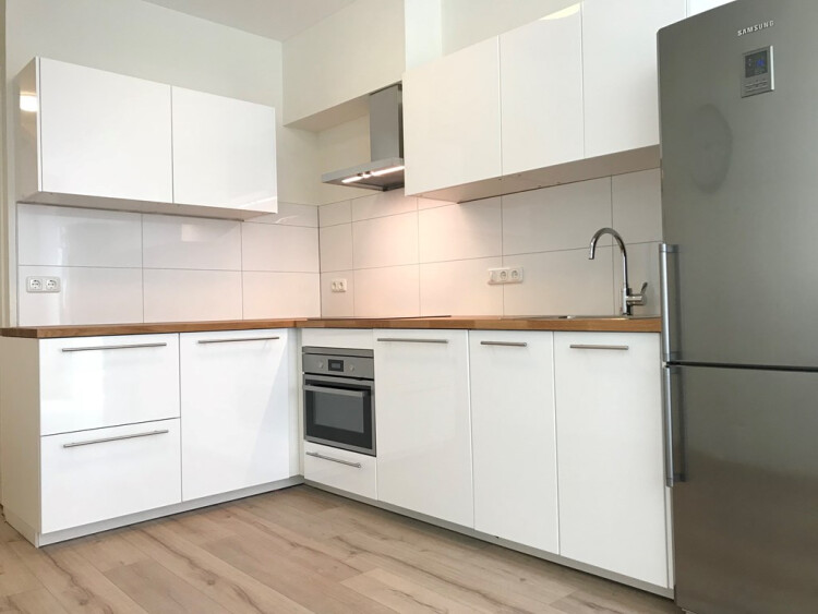 Ruime en lichte woonkamer met trap naar de tweede etage en toegang tot het terras gelegen op het noordoosten. Nieuwe keuken voorzien van alle benodigde voorzieningen. Gastentoilet.