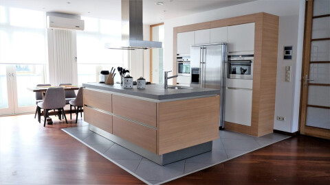 - open keuken met divers inbouwapparatuur en kookeiland