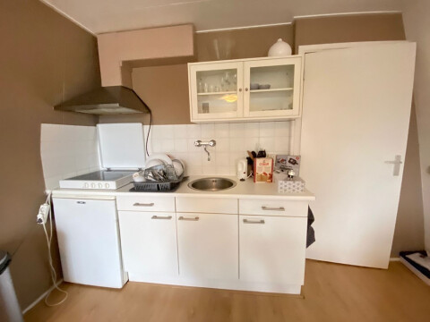 Algemeen entree op de begane grond, trap naar de 3e etage, entree appartement, lange hal met apart toilet, woonkamer met open keuken gelegen aan de voorzijde, slaapkamer met douche gelegen aan de achterzijde.