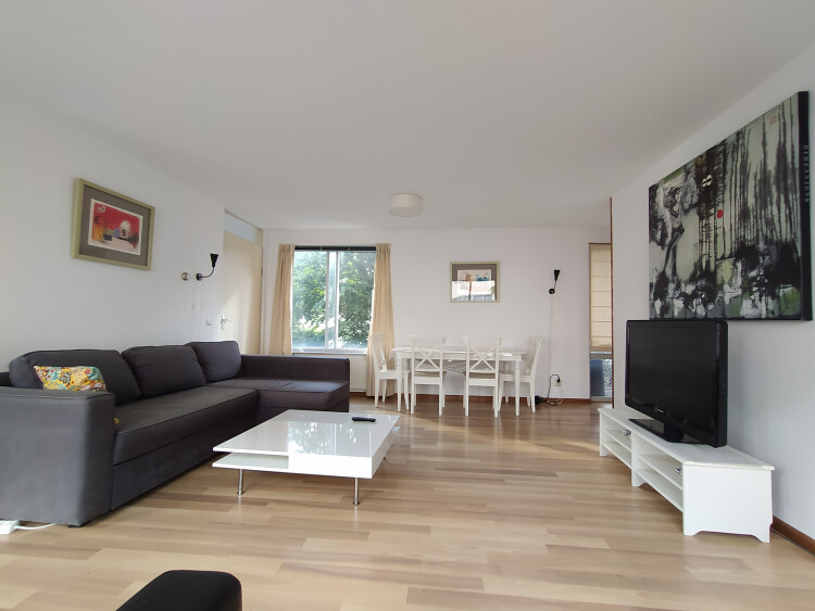The spacious living room is at the end of the hall. You have windows on both the front and rear of the apartment. The view of the living room is at an inner green garden. Behind half a wall you will find the half open kitchen. From the kitchen you have an entrance to the balcony. Next to the kitchen there is also a utility room with a brand new dryer, washer and dishwasher appliances. This apartment has a separate storage room in the basement of the building.