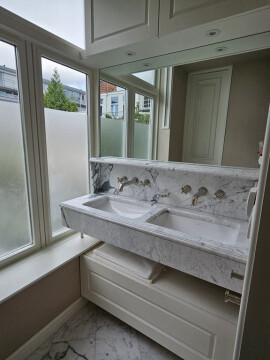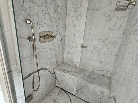 The walls of both bathroom and toilet have been beautifully decorated with Italian Statuario marble – in open book pattern (mirrored/symmetrical veins). All taps, door fittings and bathroom accessories are from the high-end brand THG (Paris) – finished in polished nickel. The shower has been built to function as a “wellness area”: after a busy (work) day, you may enjoy a steam bath with scented oils after showering (on a heated marble seating). The toilet is a luxurious “shower toilet” – and comes equipped with all functions you desire for optimal toilet use.