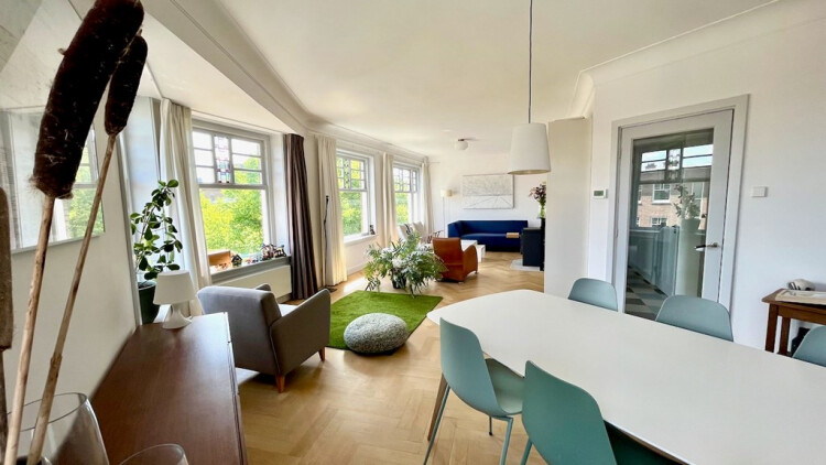 Spacious and bright corner apartment with two bedrooms and balcony at Vondelstraat. This unique corner apartment features windows from left to right, allowing light to come through the whole living room, and a fantastic kitchen with a large dining area. Situated on the third floor of a well maintained building from 1930 and was designed by the famous Dutch architect Berlage. With ca. 130m2 and an additional attic of ca. 75m2 this could be the perfect home for a family or couple who wishes to live near the historical city centre of The Hague in the lovely Zeeheldenkwartier. Original details and finishes such as a stone and operational fire place. The apartment is fitted with wooden flooring,