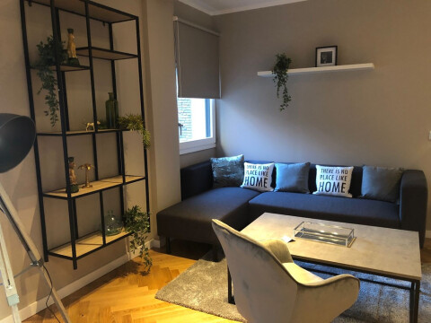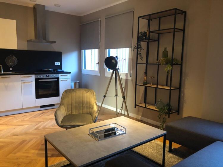 Entrance from the street. Stairs to the first floor with long hallway. Doors to all the apartments. Entrance to the apartment to small hall which is attached to the living area with modern open designer kitchen. Kitchen with appliances such as dishwasher, stove, oven / microwave, ample storage space and fridge / freezer. Bedroom with comfortable boxspring bed and wardrobe space. Bathroom with walk-in shower, sink, towel radiator and toilet. Wooden parquet flooring, centrally heated.