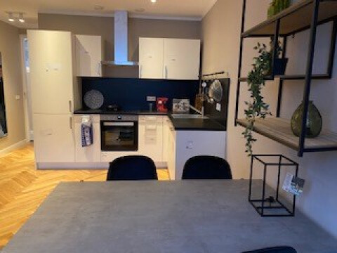 Entrance from the street. Stairs to the first floor with long hallway. Doors to all the apartments. Entrance to the apartment to small hall which is attached to the living area with modern open designer kitchen. Kitchen with appliances such as dishwasher, stove, oven / microwave, ample storage space and fridge / freezer. Bedroom with comfortable boxspring bed and wardrobe space. Bathroom with walk-in shower, sink, towel radiator and toilet. Wooden parquet flooring, centrally heated.