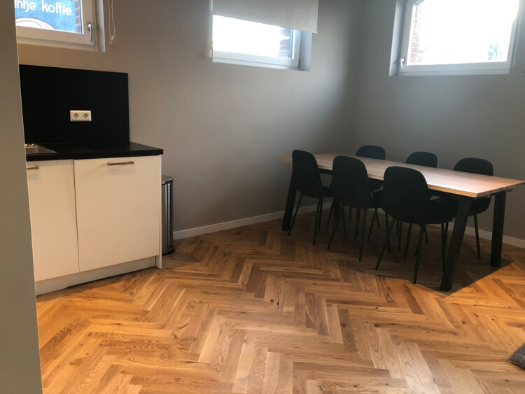 Entrance from the street. Stairs to the first floor with long hallway. Doors to all the apartments. Entrance to the apartment to small hall which is attached to the living area with modern open designer kitchen. Kitchen with appliances such as dishwasher, stove, oven / microwave, ample storage space and fridge / freezer. Bedroom with comfortable boxspring bed and wardrobe space. Bathroom with walk-in shower, sink, towel radiator and toilet. Wooden parquet flooring, centrally heated.