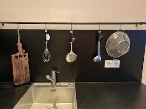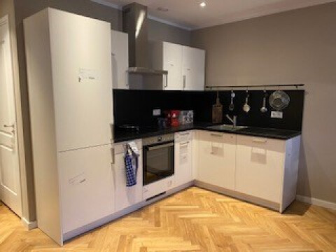 Entrance from the street. Stairs to the first floor with long hallway. Doors to all the apartments. Entrance to the apartment to small hall which is attached to the living area with modern open designer kitchen. Kitchen with appliances such as dishwasher, stove, oven / microwave, ample storage space and fridge / freezer. Bedroom with comfortable boxspring bed and wardrobe space. Bathroom with walk-in shower, sink, towel radiator and toilet. Wooden parquet flooring, centrally heated.